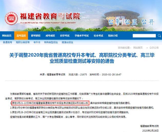 1.原定3月21-22日举行的福建省普通高校专升本招生考试推迟到4月份或以后,具体安排将根据疫情防控情况提前通知。