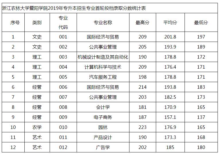 浙江农林大学暨阳学院2019年浙江省专升本招生首轮投档录取已结束,录取结果已可在本网站查询。考生可以在本网站“录取查询”专栏“专升本拟录取查询”项中输入考生本人的身份证号码及姓名,查询是否被我院录取。本次招生录取各类别分数详见下表: