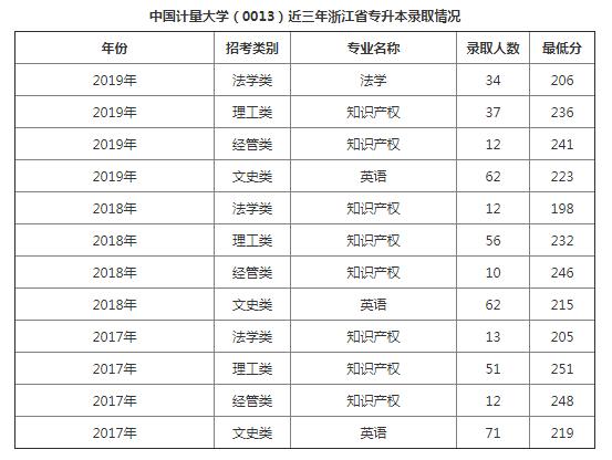 中国计量大学(0013)近三年浙江省专升本录取情况