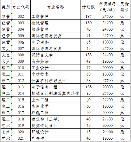 2020年学校专升本招生计划共1500名,比去年增加500名,并在原有基础上增加9个招生专业,分别是经管类的旅游管理、电子商务专业,理工类的土木工程、应用化学、环境工程、建筑学(三年制)专业,艺术类的视觉传达设计、环境设计、广告学专业,目前专升本一共有19个专业招生,其中计算机科学与技术、环境设计为省一流专业,分专业招生计划见下表: